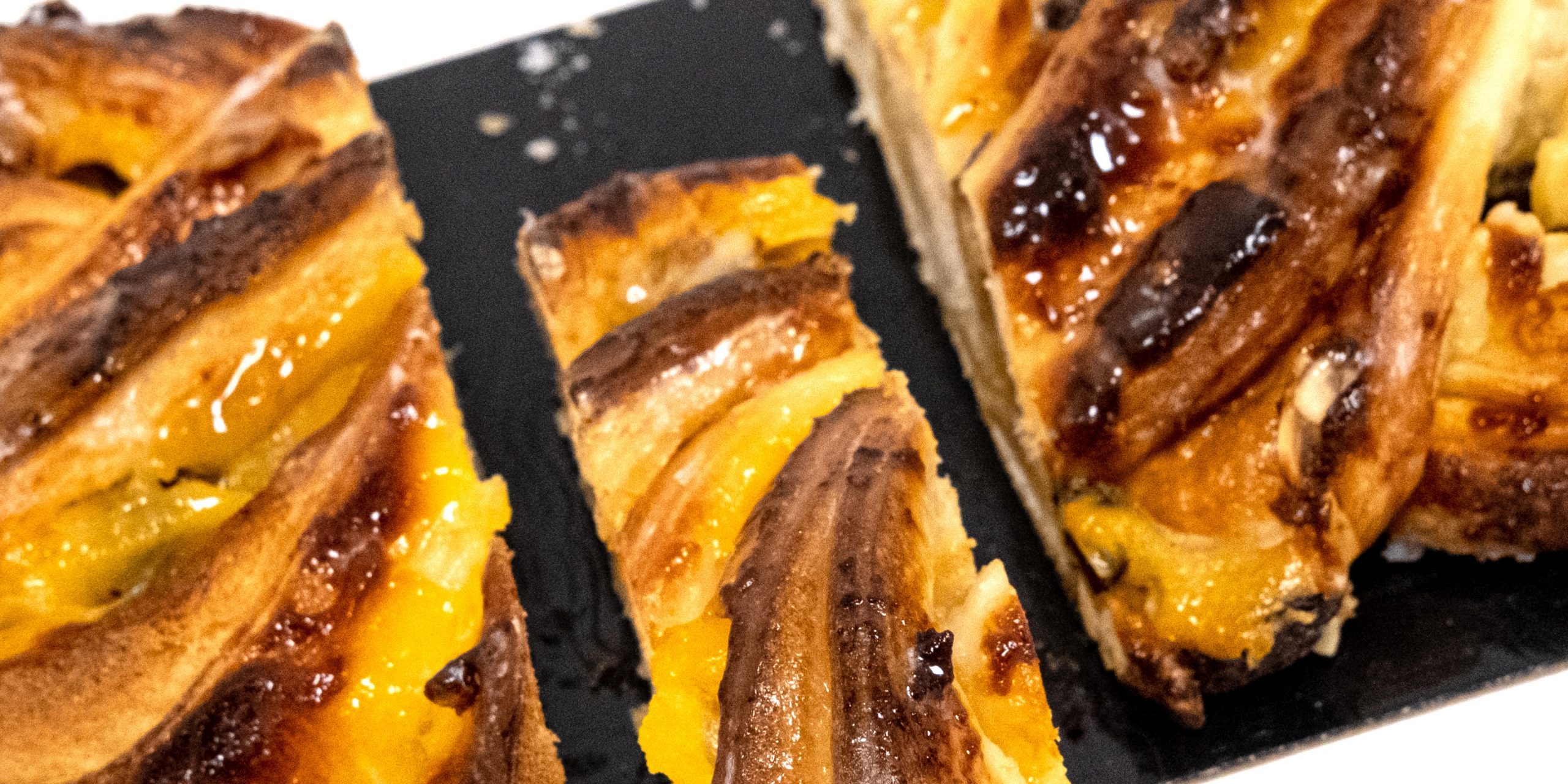 - Mini trenza de frutos secos: Compuesta de una masa hojaldrada elaborada mediante las materias primas tradicionales, aroma de mantequilla, pasas, nueces partidas y almendras. También las realizamos de yema de huevo y de cacao.